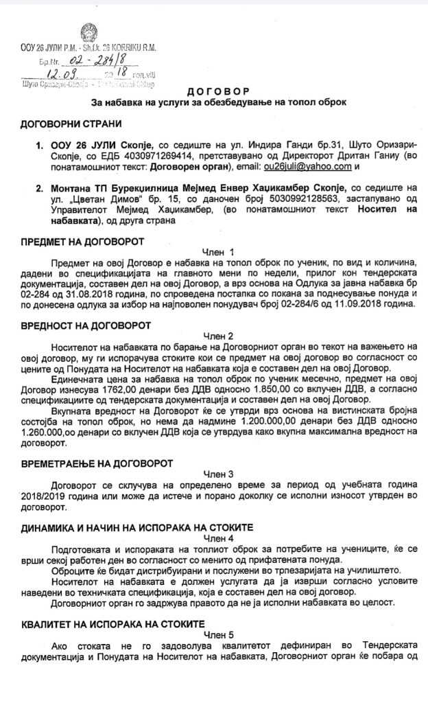 Ko uchebno 2018/19 bersh i Shkola 26to Juli ki Komuna Shuto Orizari denga tenderi e burekcilnicake « TP Burekcilnica Montana » ko vrednost taro 1.260.000 denarija ili pa 1850 denarija ko uceniko/masek so ko dive negde o tato obrok « bureko » koshtinela 84.09 denarija, soj tano hari Skupo jekhe burekoske ili tato obrok ko Skopje.